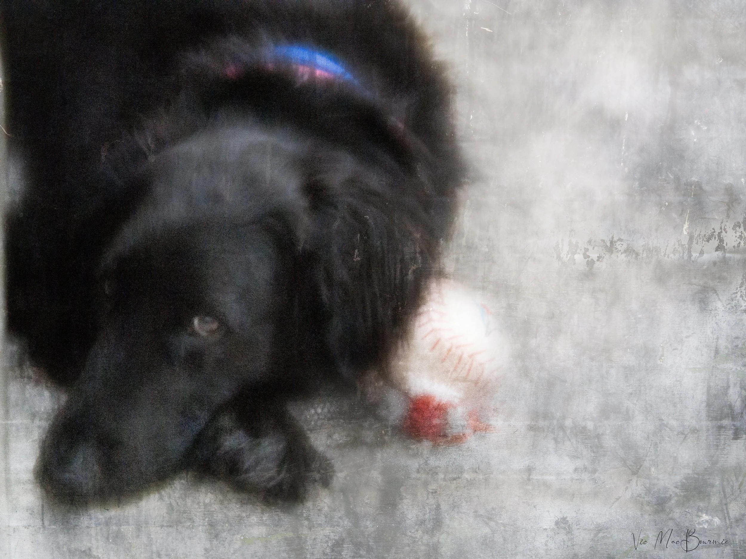 Our rescue Flat-Coated Retriever with his baseball stuffy taken with the Lensbaby Velvet 56 with two textures added for a painterly effect.