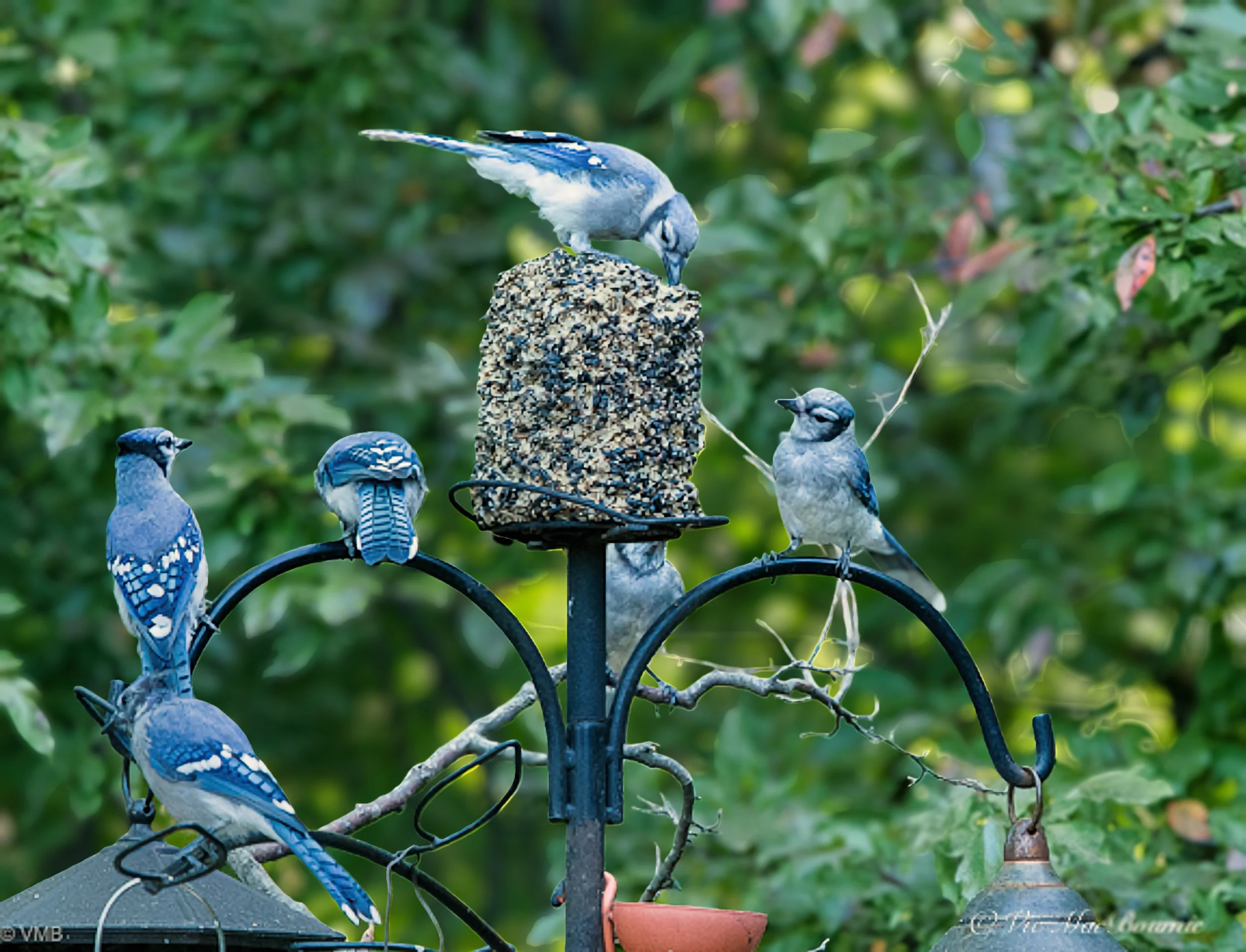 This After picture of blue jays at the feeder is improved by softening the background bokeh helping the birds stand out better from the background. (see image below)