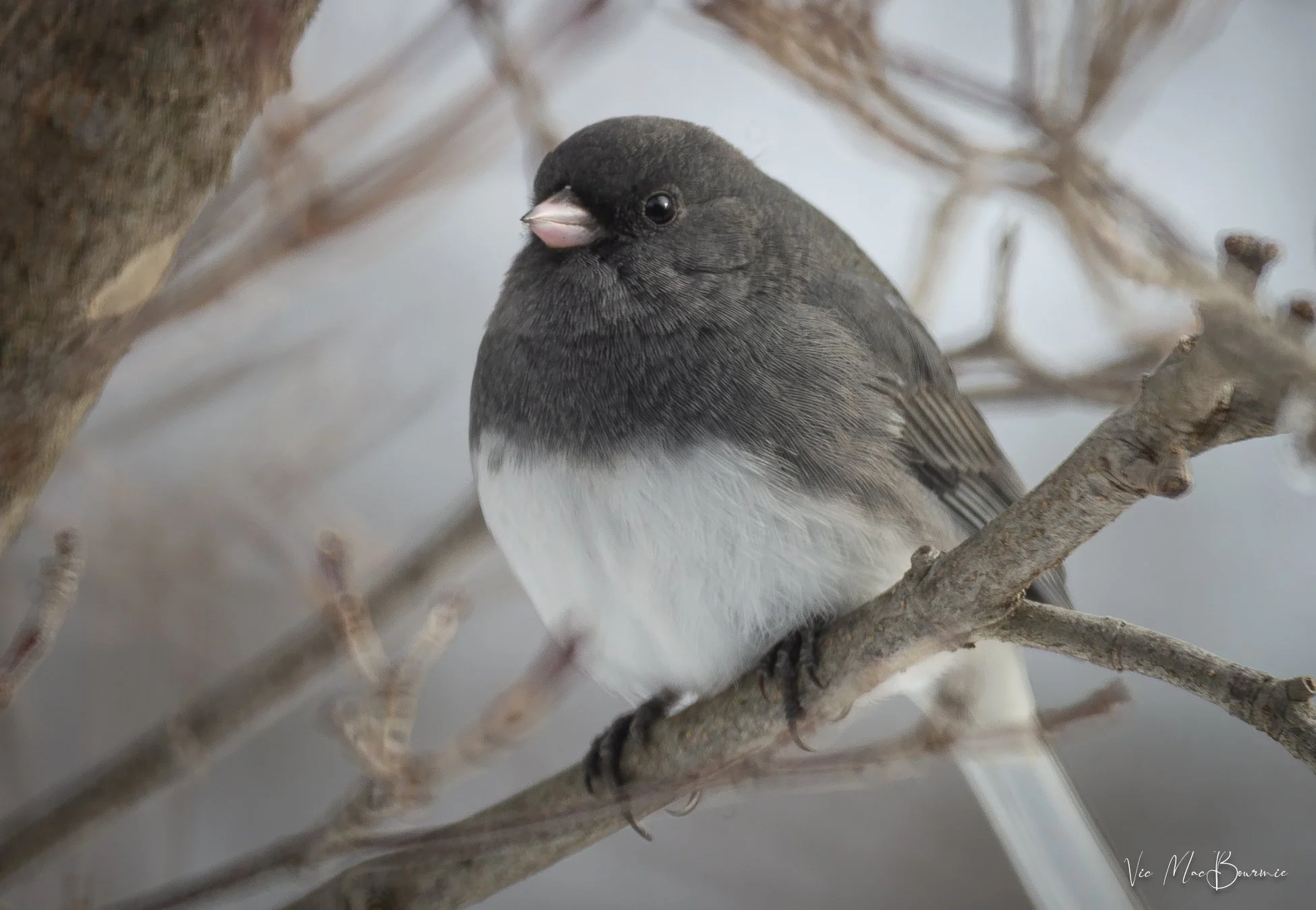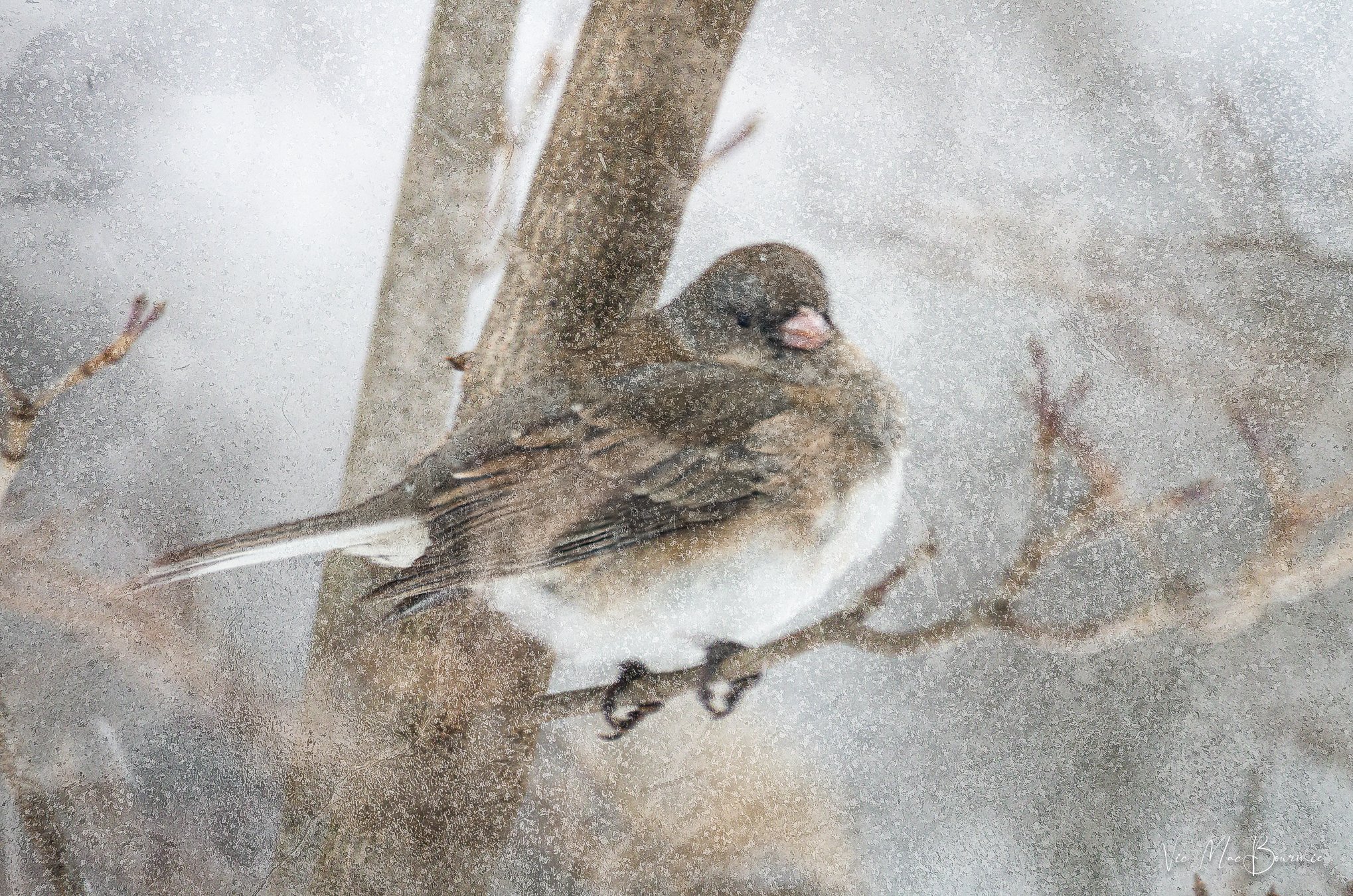 The owl image above gives a hint of the painterly bokeh in the out-of-focus green leaves in the background. The image below of a Junco in a snowstorm with two textures added, takes the painterly look to the extreme.