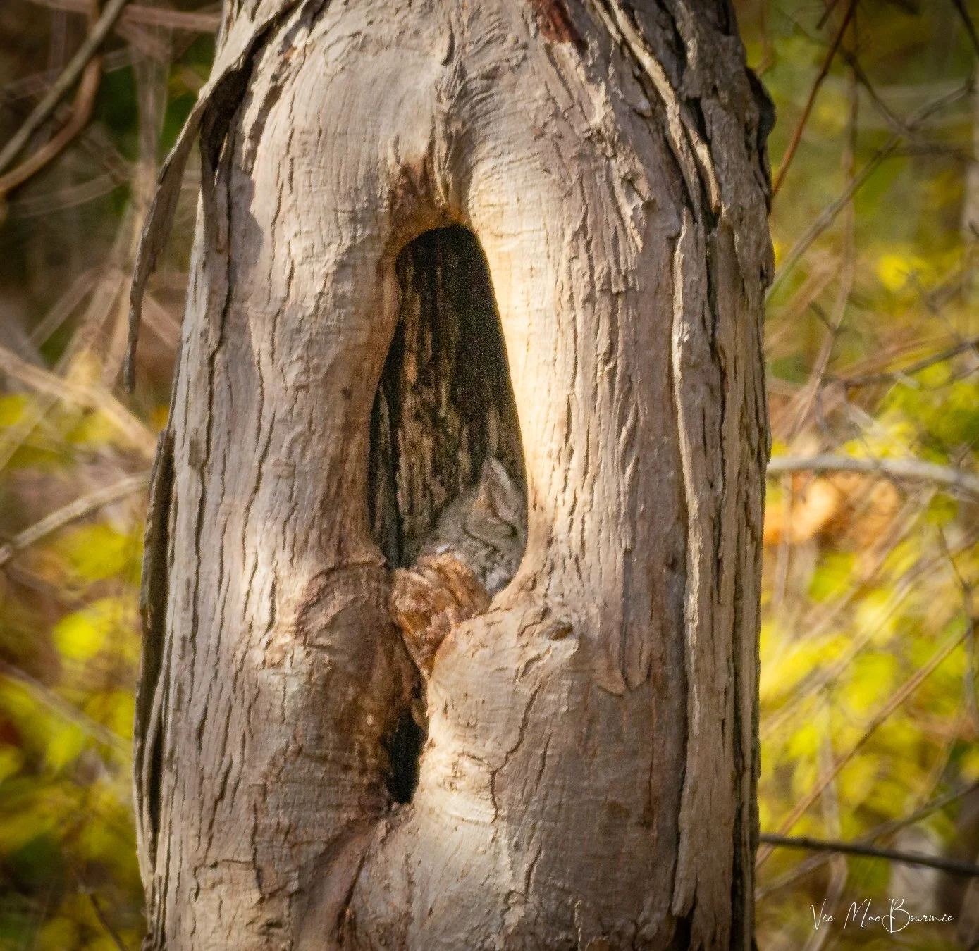 This sleeping screech owl is the perfect subject for the 800mm equivalent lens on an APSC camera like the Pentax K5. In this case, a monopod helped me steady the camera and lens.